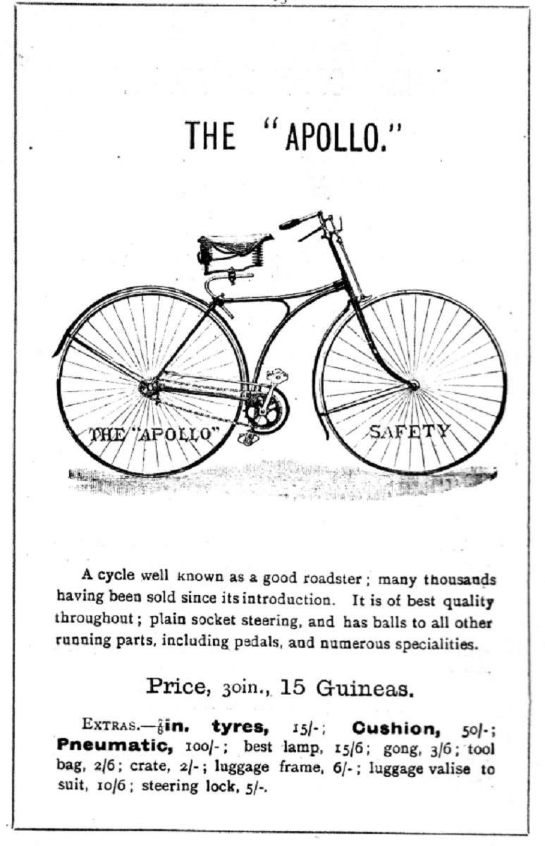 The Singer Apollo was the first Singer safety bicycle with wheels of equal size, introduced in 1887. It was built until 1891-1892. To confuse matters, they also had an ordinary bicycle called Singer Apollo.
